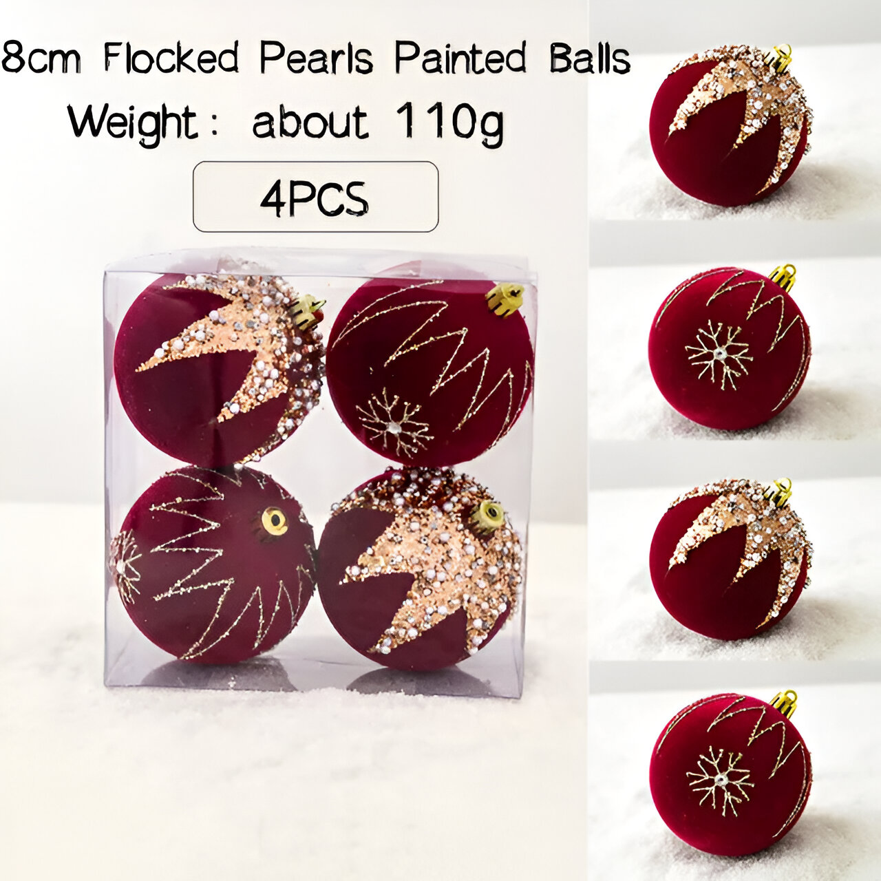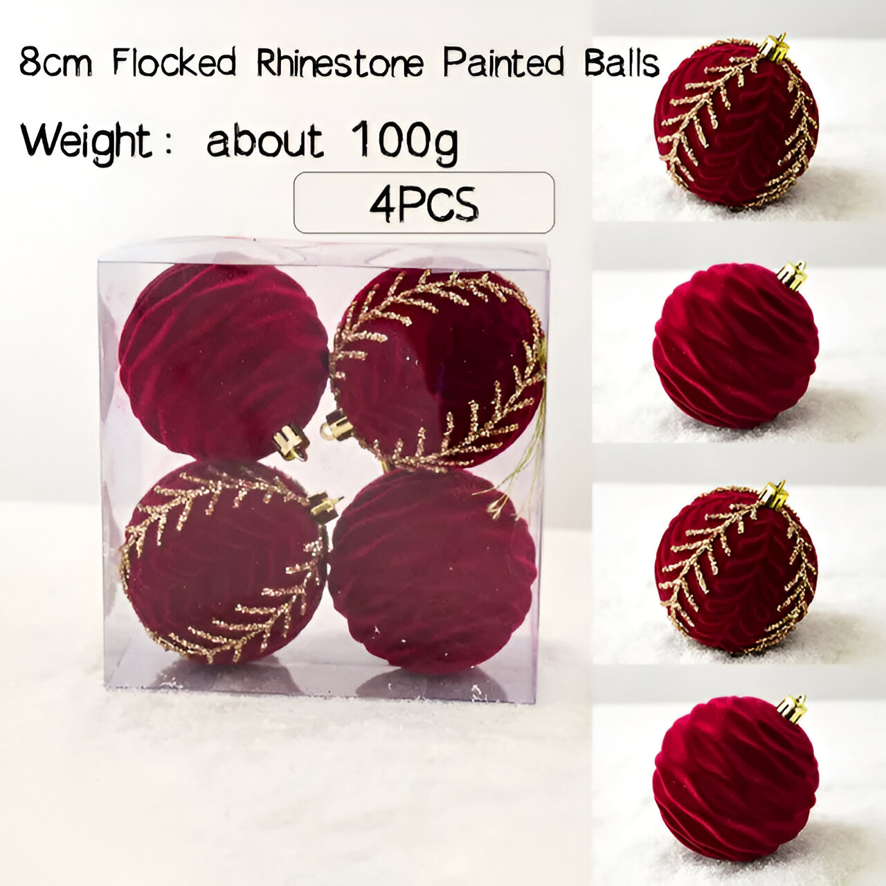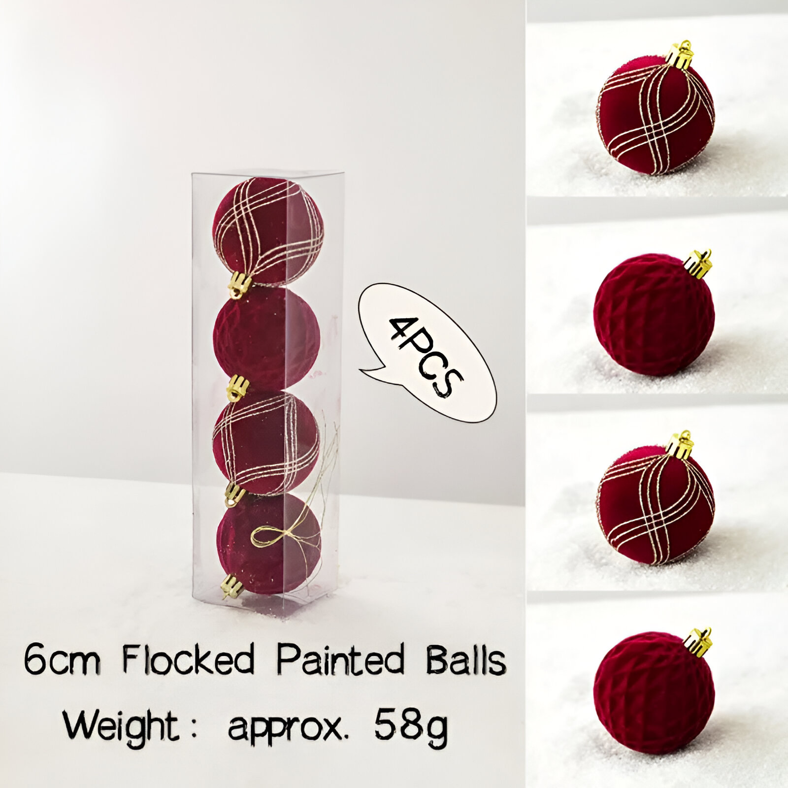 4Pcs Christmas Red Flocking Painted Balls – Festive Tree Decorations
