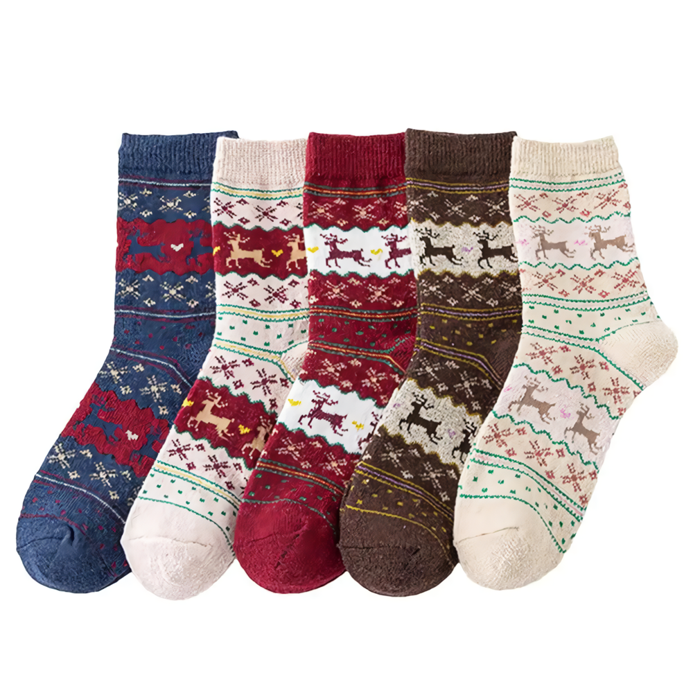 5 Pcs Women’s Christmas Wool Socks Set with Santa & Reindeer Patterns