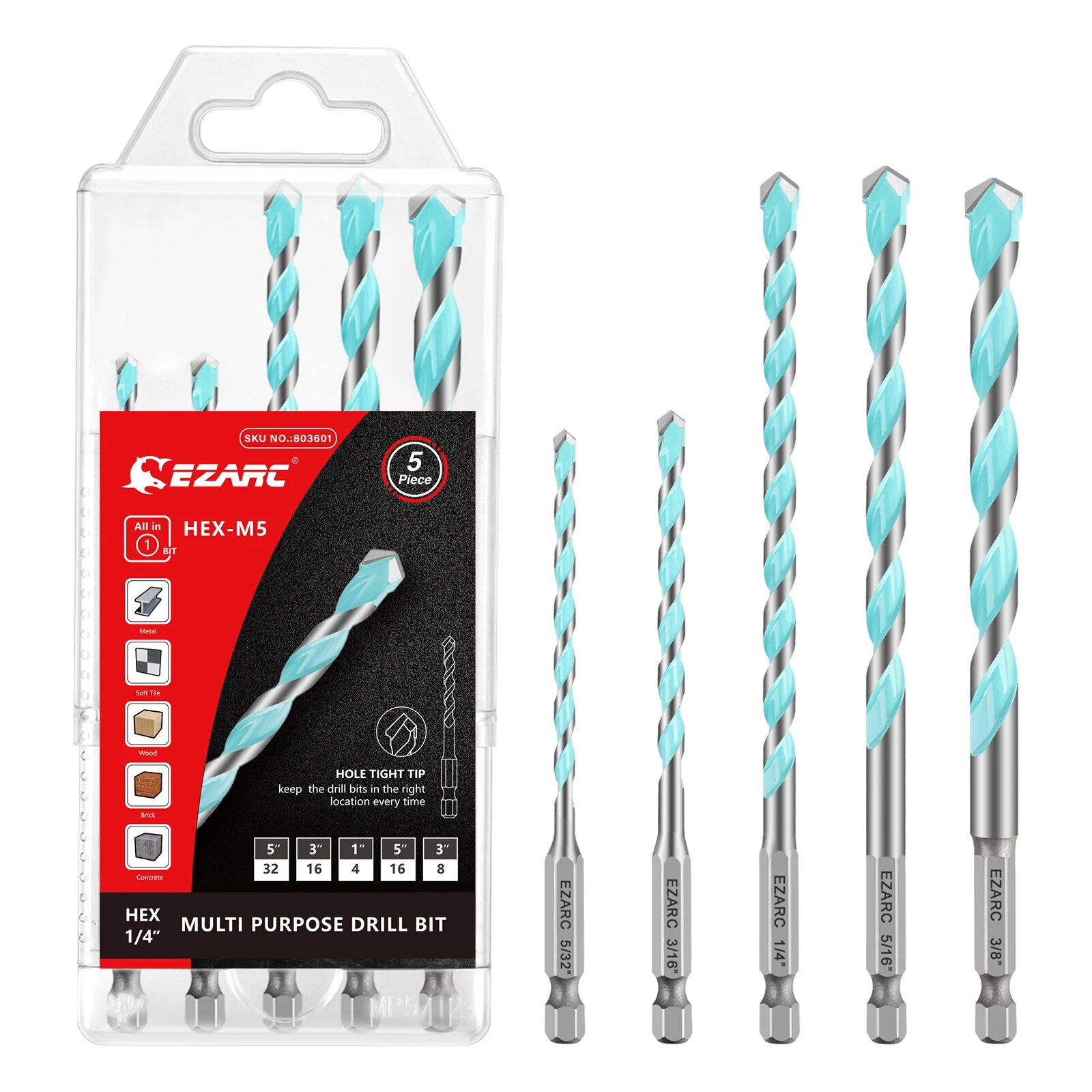 5PC Multi-Purpose Carbide Drill Bit Set with Hex Shank for Metal, Masonry, Wood, Brick, and Plastic