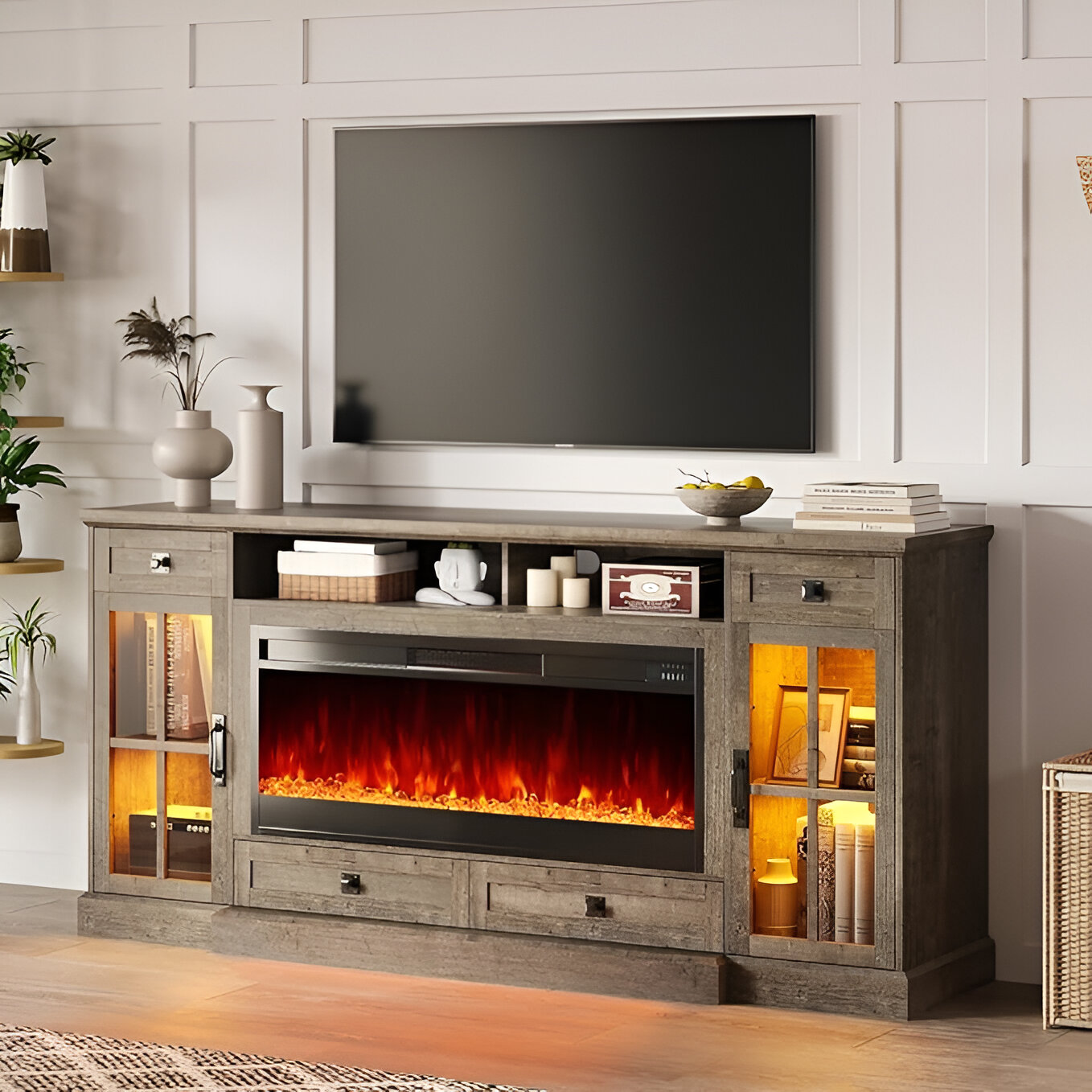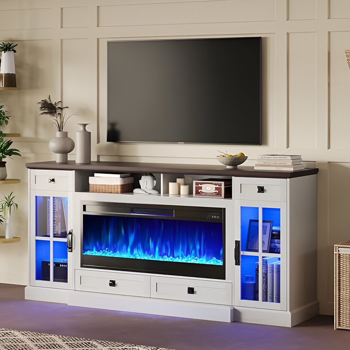 70” Farmhouse Fireplace TV Stand with 42″ Electric Fireplace & LED Lights