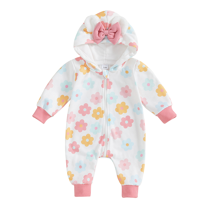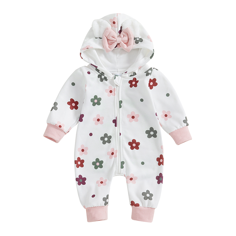 This romper stands out with its playful design and thoughtful features. The plush bear-ear hood adds a fun, whimsical touch, while the floral print offers a sweet and stylish vibe. Its premium fleece material is both warm and breathable, ensuring your baby’s comfort throughout the day.