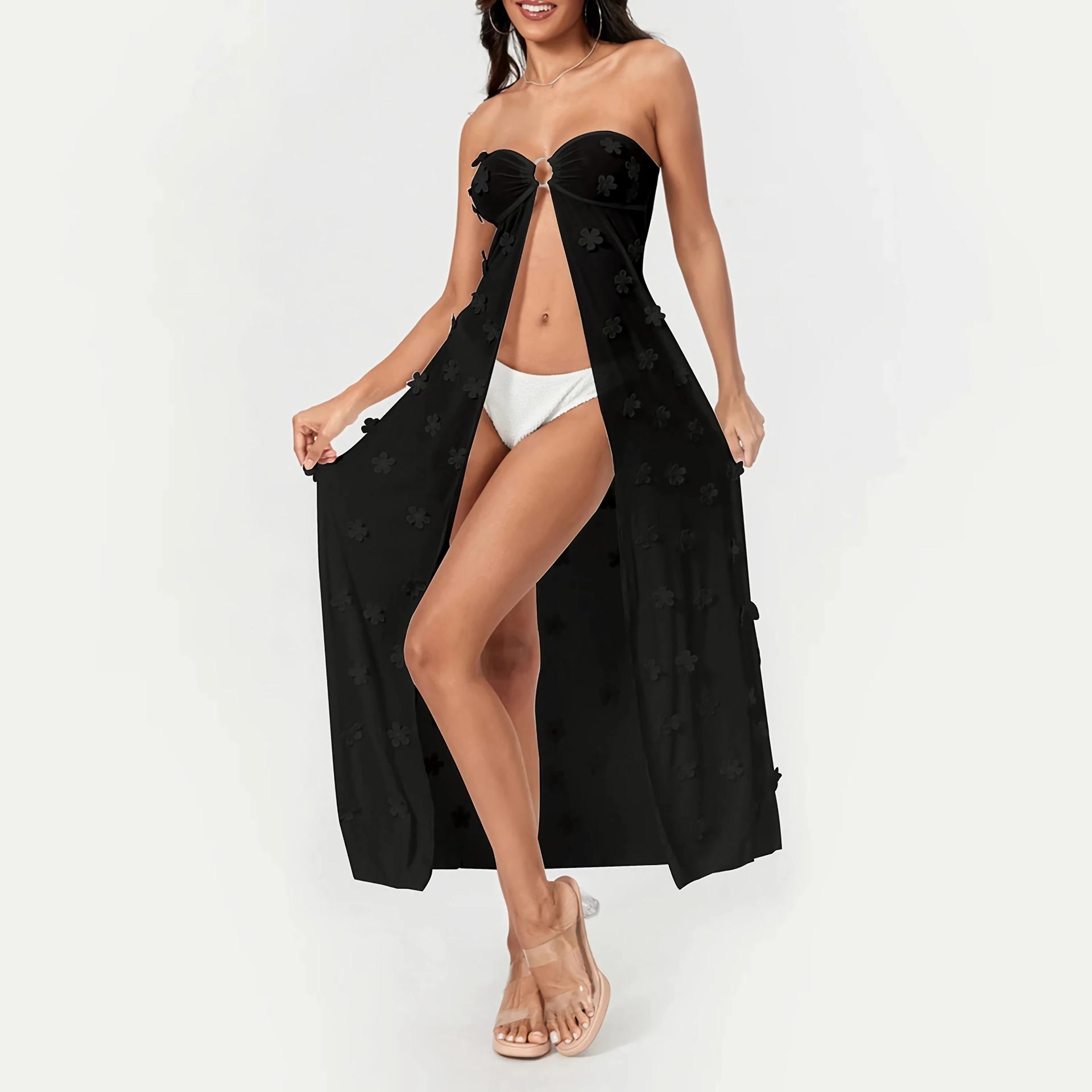 Elevate your beachwear game with our Sexy Mesh Sheer Beach Cover Up Boho Bikini Dress. This stunning piece is designed to turn heads, featuring intricate flower embellishments and a see-through, strapless design that embodies the essence of summer style.