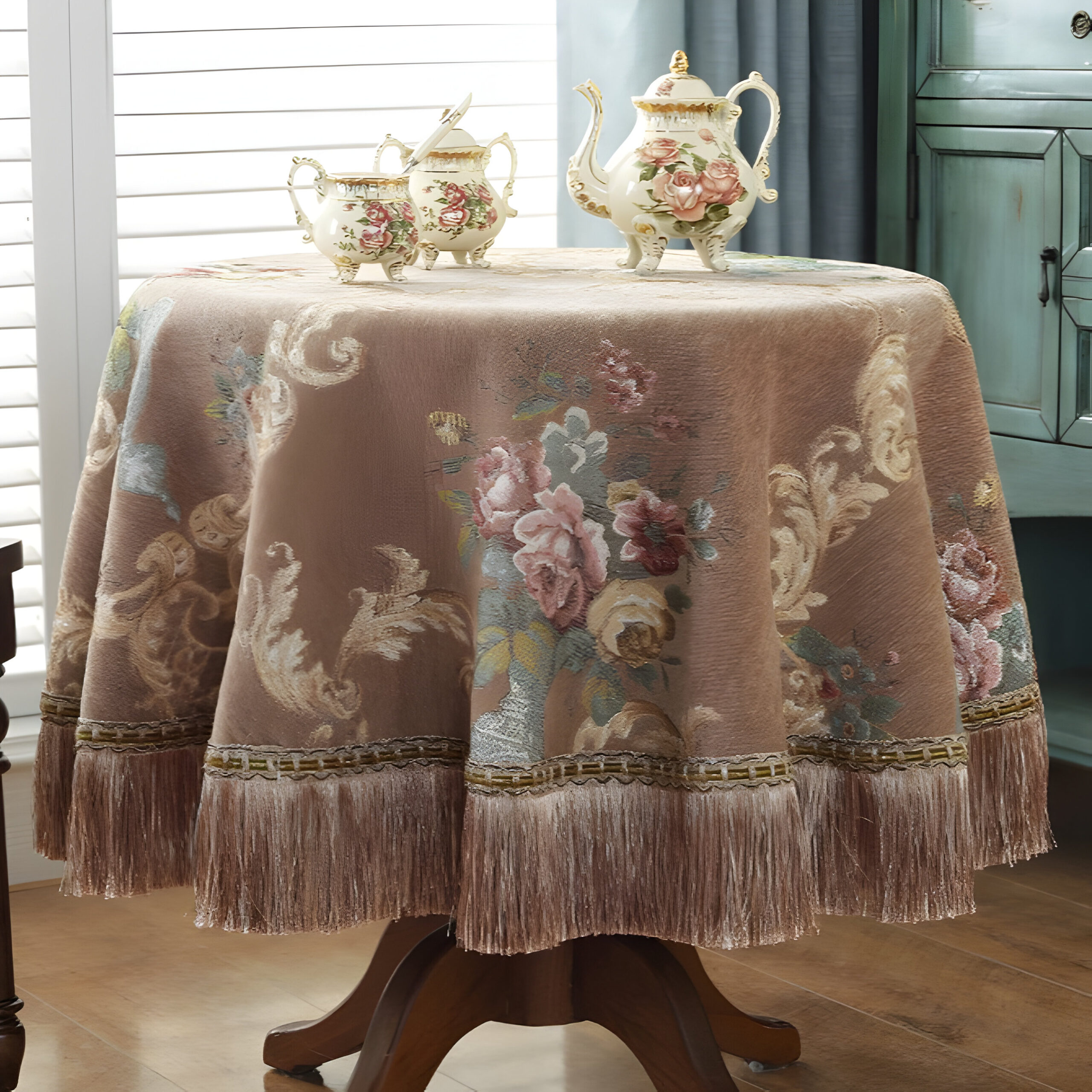 The European Tassel Embroidered Round Tablecloth stands out for its combination of aesthetic appeal and practical features. The woven chenille fabric adds a rich texture, while the dustproof and oilproof finish ensures easy cleaning and maintenance. Its floral embroidery and tassel detailing make it a unique centerpiece that draws attention and enhances your decor.