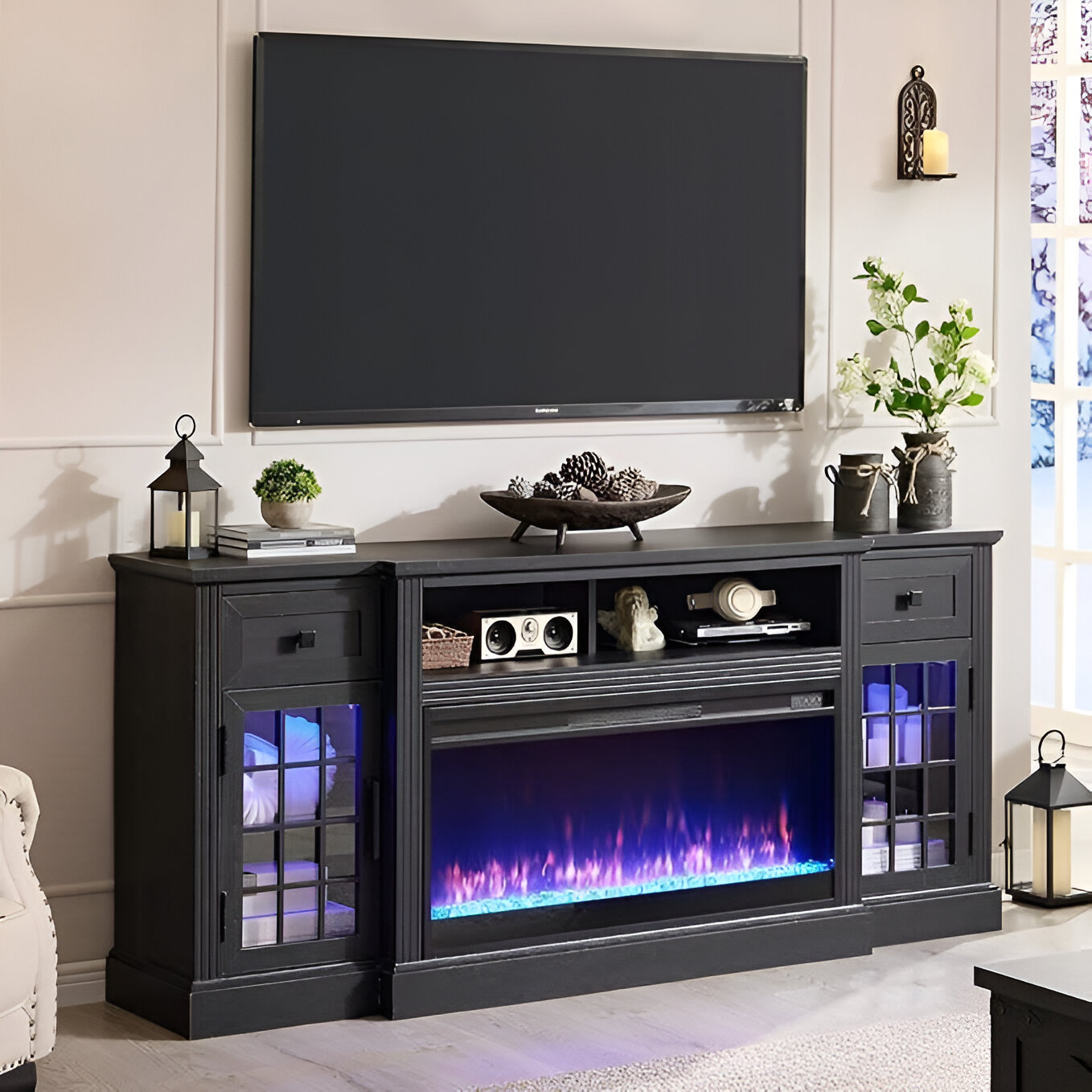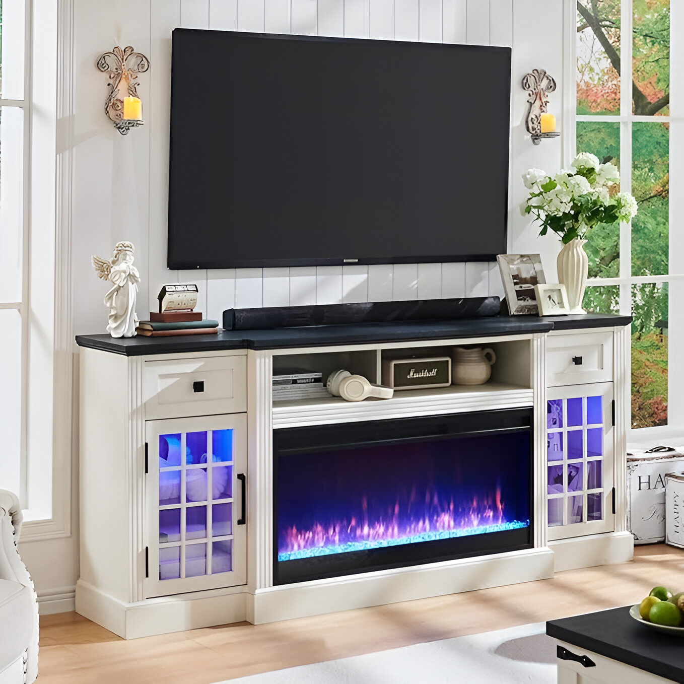 This TV stand isn’t just about looks—it’s crafted to be the ultimate blend of style and utility. The sleek 36-inch electric fireplace takes center stage, boasting 7 adjustable flame colors and a customizable ember bed. Surrounding it are LED-lit side cabinets with adjustable shelves, offering a chic touch and optimal organization. The top drawers, semi-open shelf, and glass door cabinets provide ample storage for all your entertainment essentials, while the wide tabletop accommodates TVs up to 80 inches.