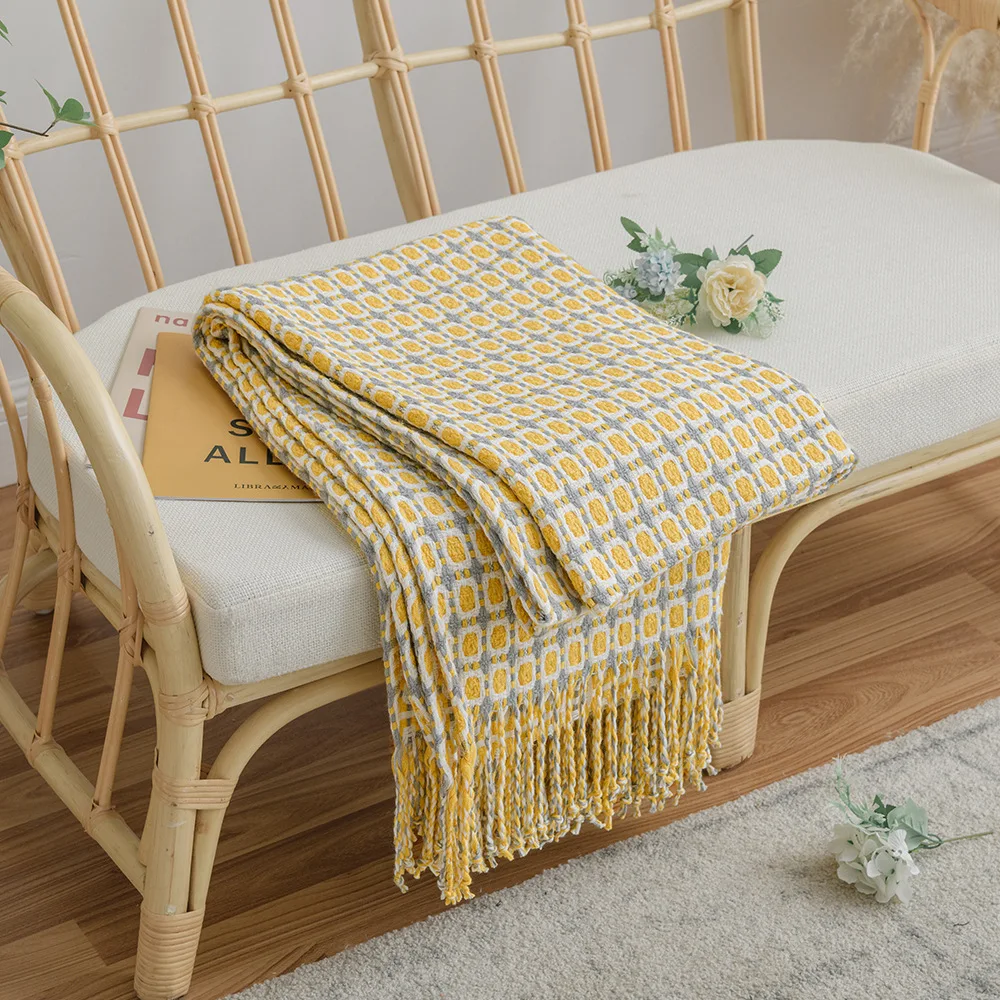 This knitted throw blanket is more than just a cozy accessory. Its twill weave and geometric pattern offer a decorative touch that complements any interior design style. Whether you’re relaxing on the couch, traveling, or simply looking to enhance the décor in your living room, this blanket delivers both practicality and elegance. Its lightweight, breathable material makes it perfect for use during spring, summer, and early autumn, while its anti-sunlight properties ensure the colors stay vibrant and beautiful even after repeated use.