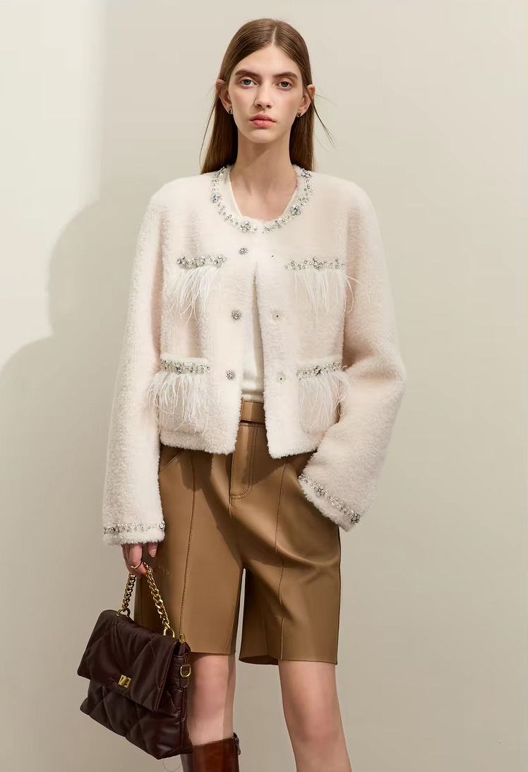 The blend of high-quality sheep-cut fur and attention to detail makes this coat a standout piece. The nail drill embellishments and spliced fabric elevate it beyond ordinary winter outerwear, giving it a luxurious touch. Designed for women who value both style and functionality, this coat seamlessly combines practicality with high-end fashion.