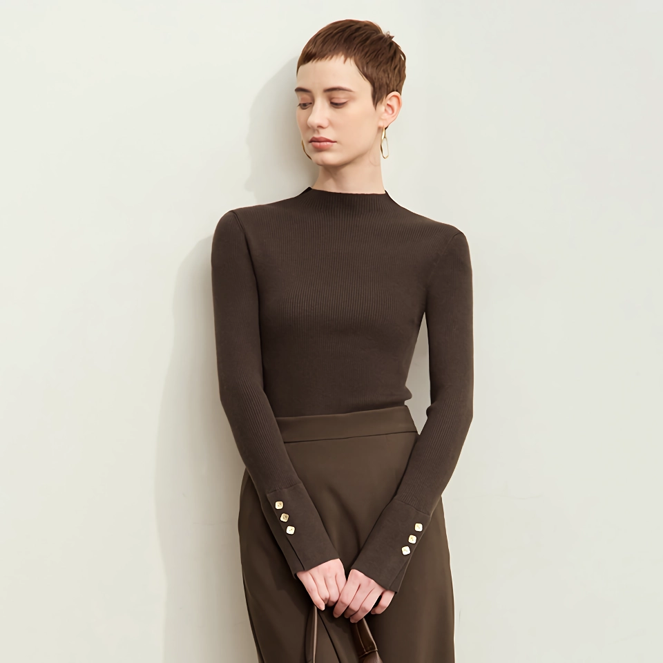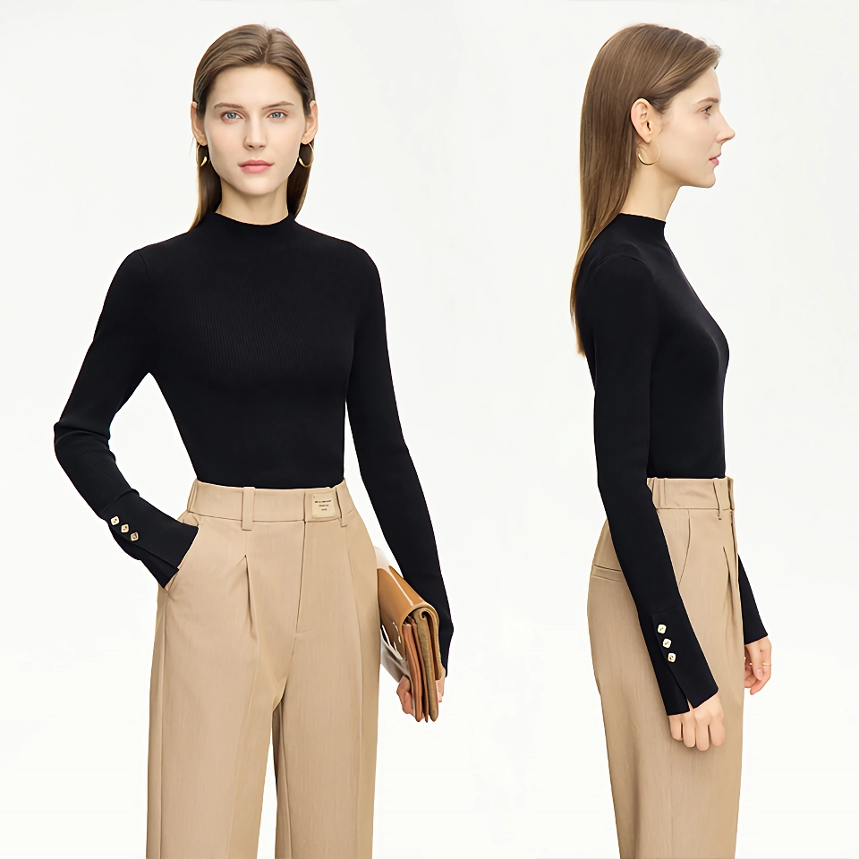 Minimalist Mock Neck Sweater with Slit Cuffs and Metal Buckle