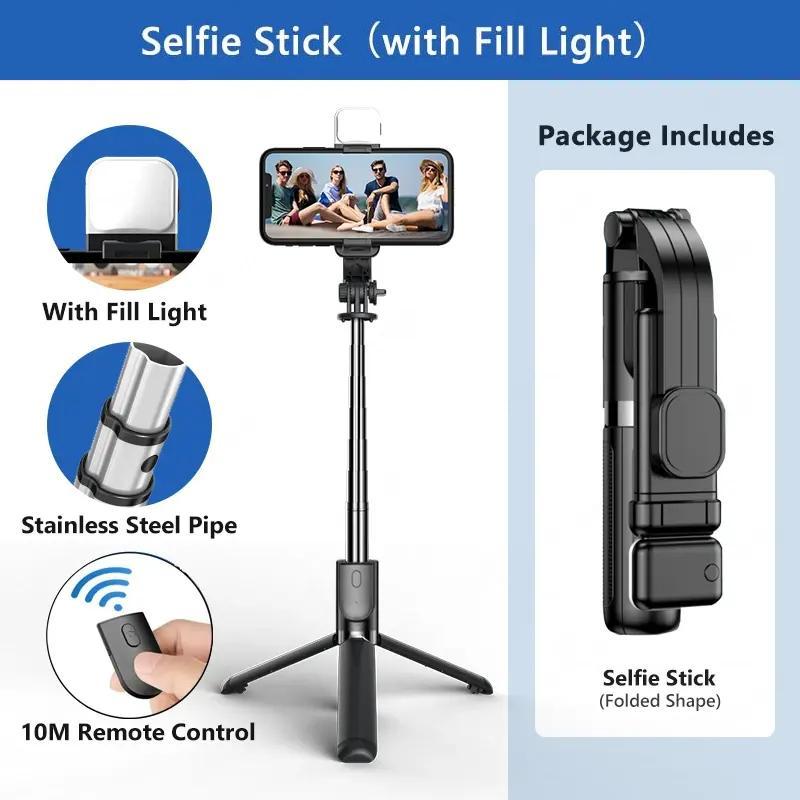 Portable Selfie Stick with Fill Light, Tripod Stand, and Bluetooth Remote