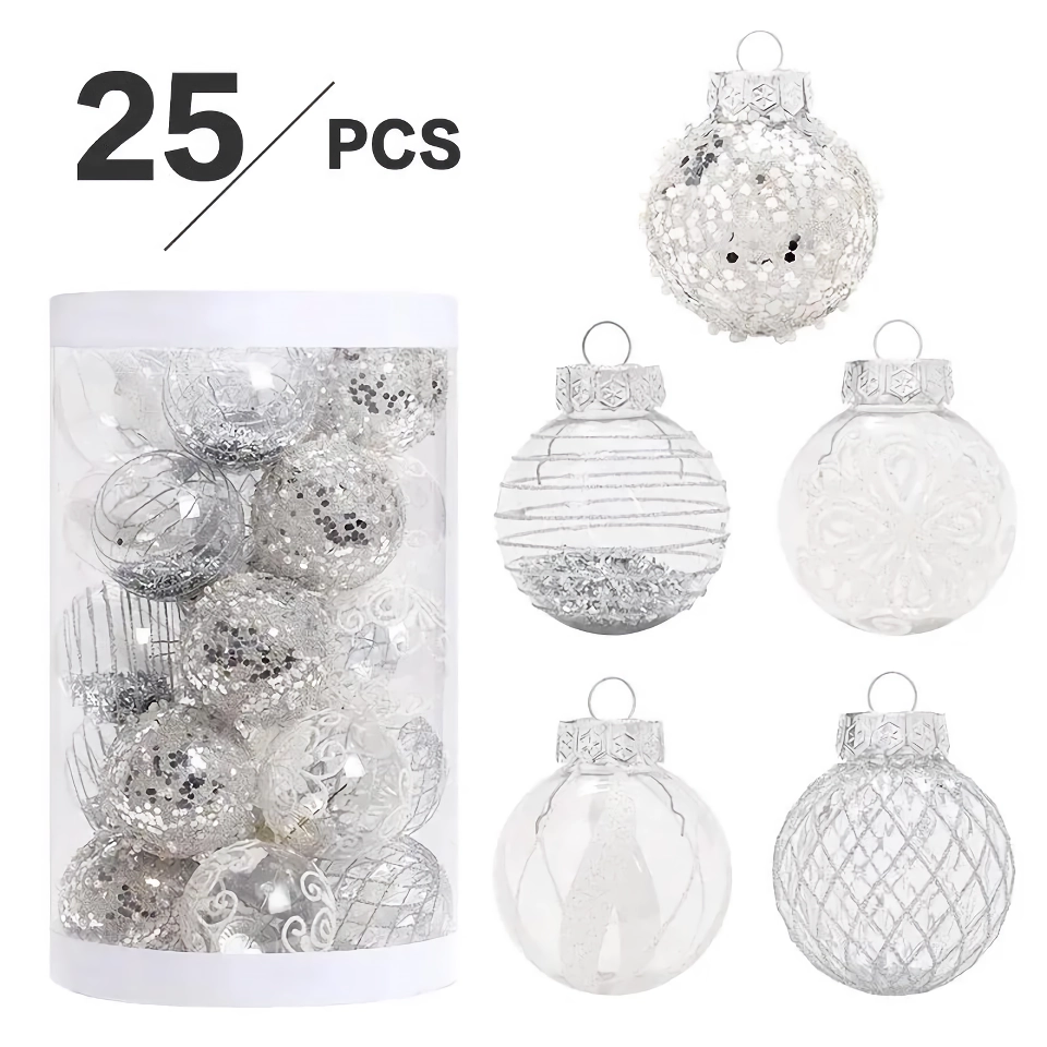 • Compact Packaging: Includes 25 ornaments neatly wrapped in a plastic container for easy storage and organization.