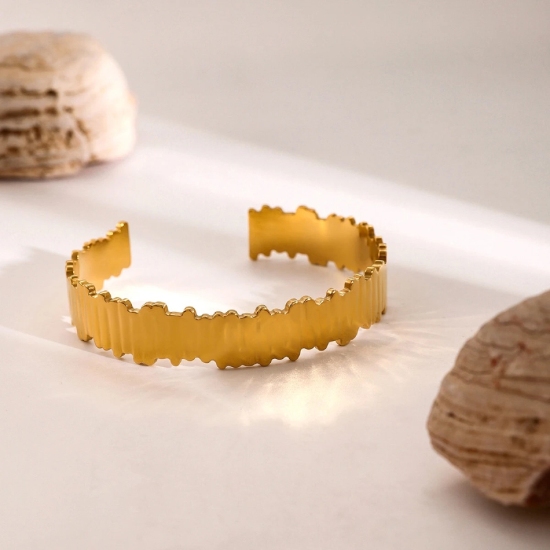 Introducing the stunning Waterproof 316L Stainless Steel Wide Cuff Bracelet, designed to elevate your jewelry collection with its modern and chic aesthetic. This bracelet features a unique textured finish that catches the light beautifully, making it the perfect accessory for any outfit. Crafted from durable stainless steel and plated with luxurious 18K PVD gold, this cuff bracelet is not just stylish; it is built to last, ensuring you can enjoy its beauty for years to come.