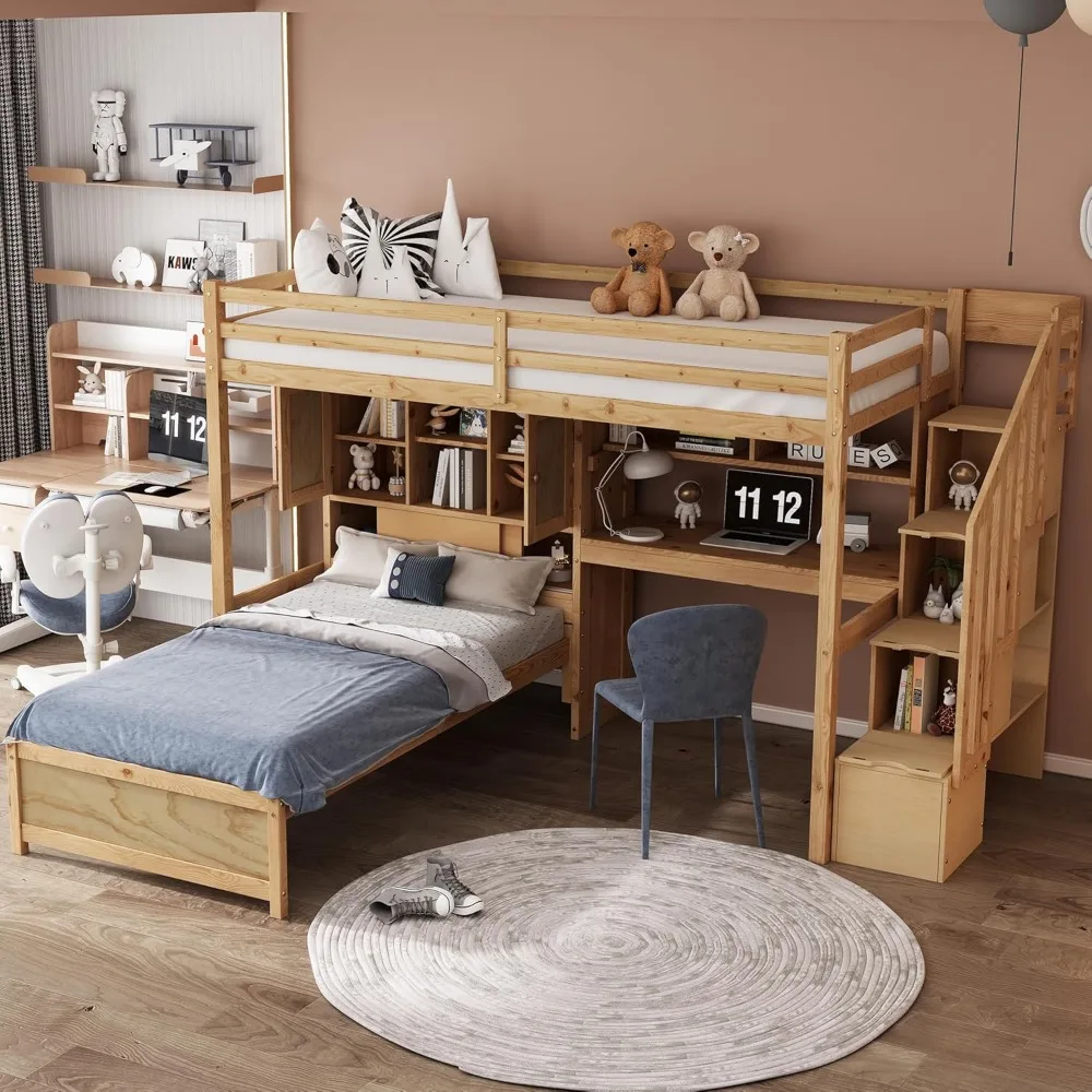 Twin Loft Bed with Stairs, Desk, Shelves, and Storage Drawers