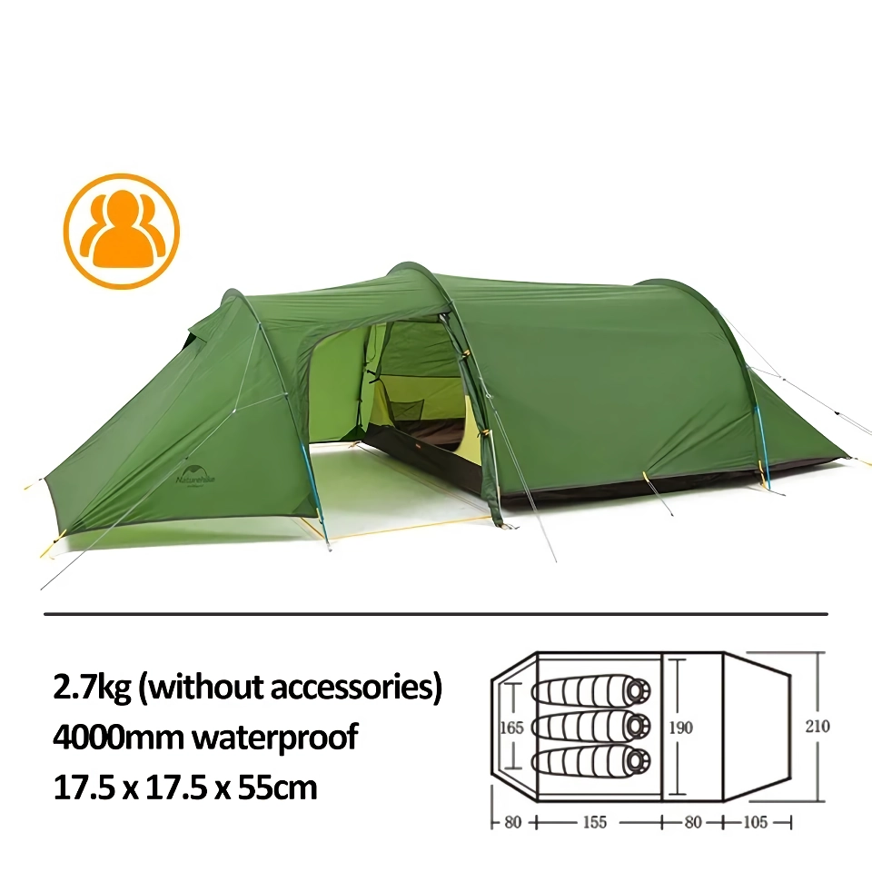 This tent’s advanced design includes a dual-layer construction, with a 20D nylon or 210T polyester tent fly and floor that resist tears and moisture, making it ideal for rugged terrains and wet climates. With an impressive waterproof index of up to 4000 mm, this tent shields you from sudden weather changes, providing a cozy, dry shelter during heavy rains. Its tunnel structure offers an expanded living area for added comfort, while B3 mesh lining ensures a breathable interior.