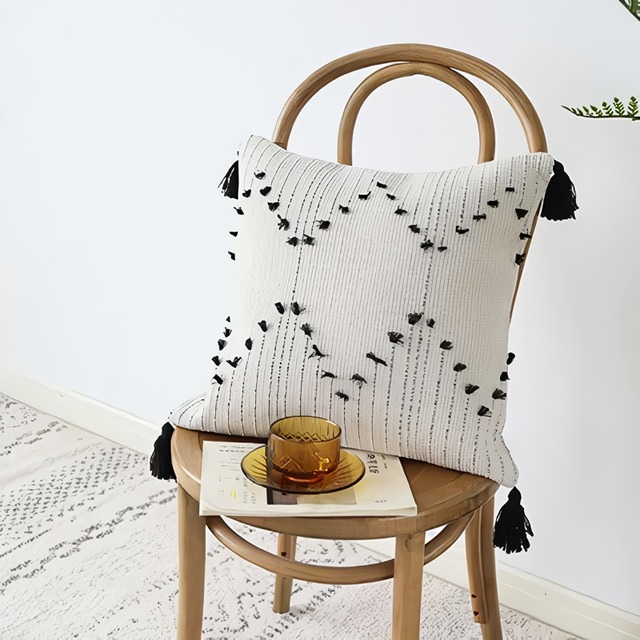 Transform your living space with this beautifully crafted White and Black Geometric Cushion Cover with Tassels. Featuring a bold, modern geometric pattern inspired by Moroccan and Nordic styles, this pillow cover is the perfect addition to any home decor. Whether it’s your sofa, bed, or favorite chair, this cushion cover adds a sophisticated yet cozy touch that will bring a sense of elegance and comfort to your room. Handwoven with premium cotton thread and finished with playful tassels, this pillow cover is designed to be both visually appealing and soft to the touch.